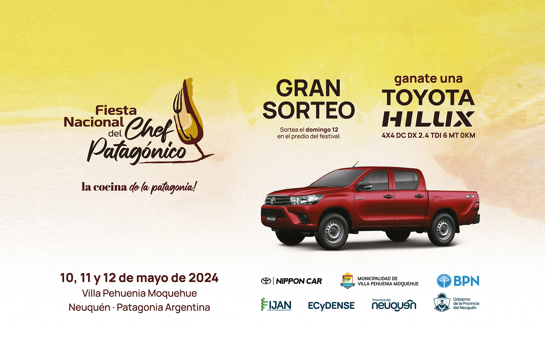 10, 11 y 12 de mayo es la cita con la gastronomía patagónica. La próxima edición de la Fiesta Nacional del Chef Patagónico promete ser aún más emocionante ya que suma el sorteo de una camioneta 0KM marca Toyota.